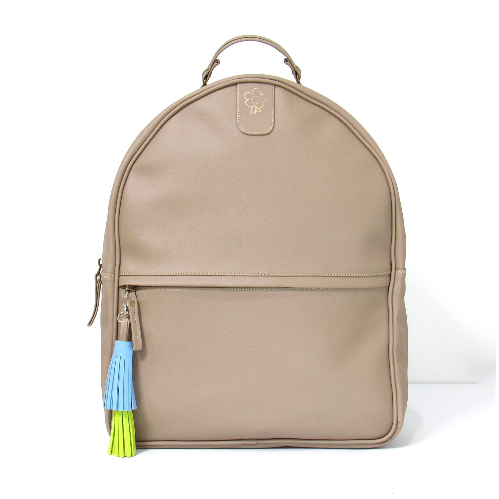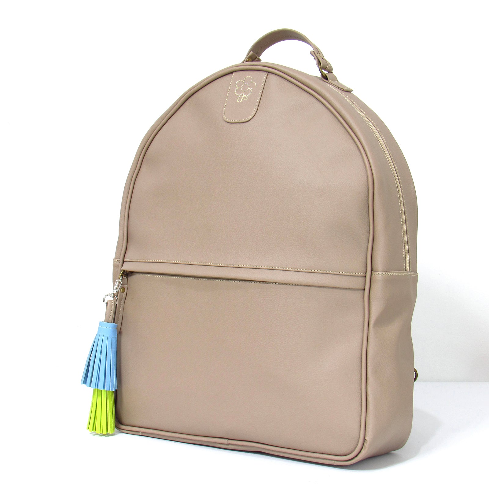 Está elaborado en cuero vegano, posee un cierre superior con gran apertura. La borla puede ser usada como llavero y está elaborada en cuero sintético, tiene un bolsillo exterior con cierre, sus correas de cuero sintético ajustables. El fondo es plano y posee forro interno con dos bolsillos.
