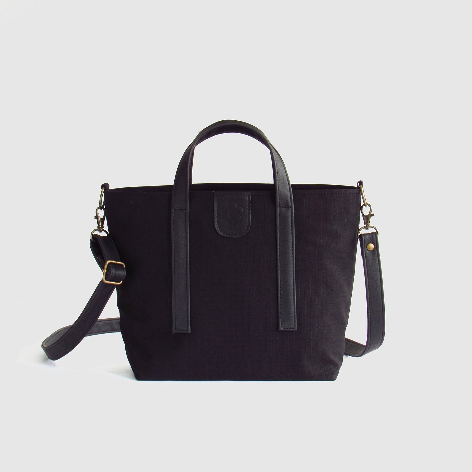 Esta elabora en textil denim, posee la marca de nuestra flor termosellada en una pieza de cuero, tiene asas cortas con 14 cm de altura, posee una correa removible de 2cm, cierre superior para un cierre práctico, en el interior el forro es en tela impermeable con 2 bolsillos.