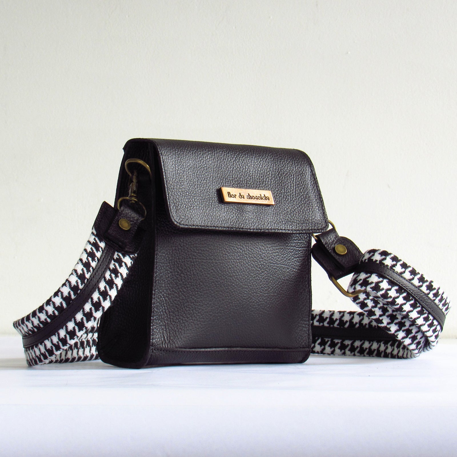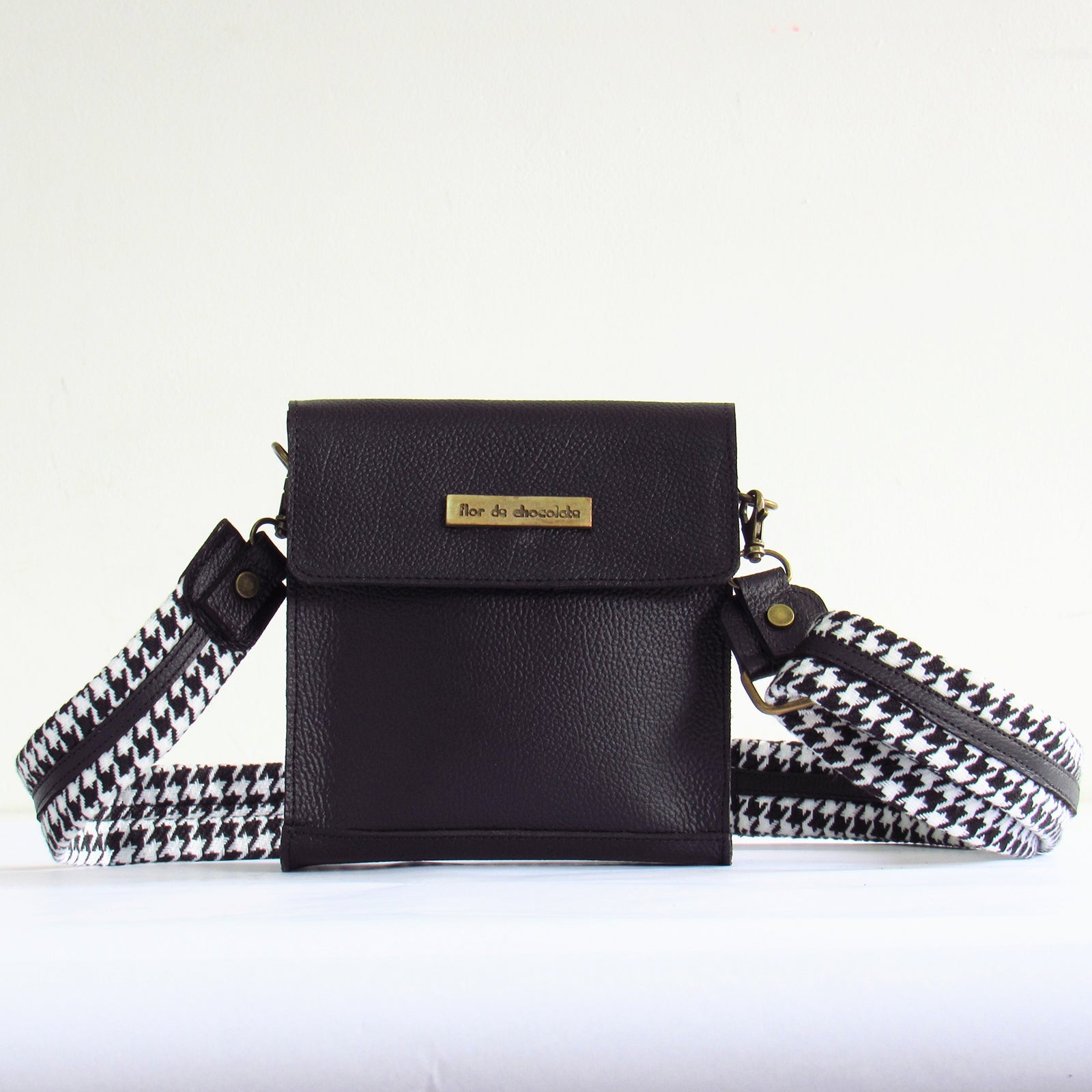 Pieza elaborada en cuero vacuno, correa de 4 cm de ancho, regulable en textil con estampado escocés y cuero vacuno, tapa con broche imantado, forro interno en textil impermeable con dos bolsillos, herrajes envejecidos.