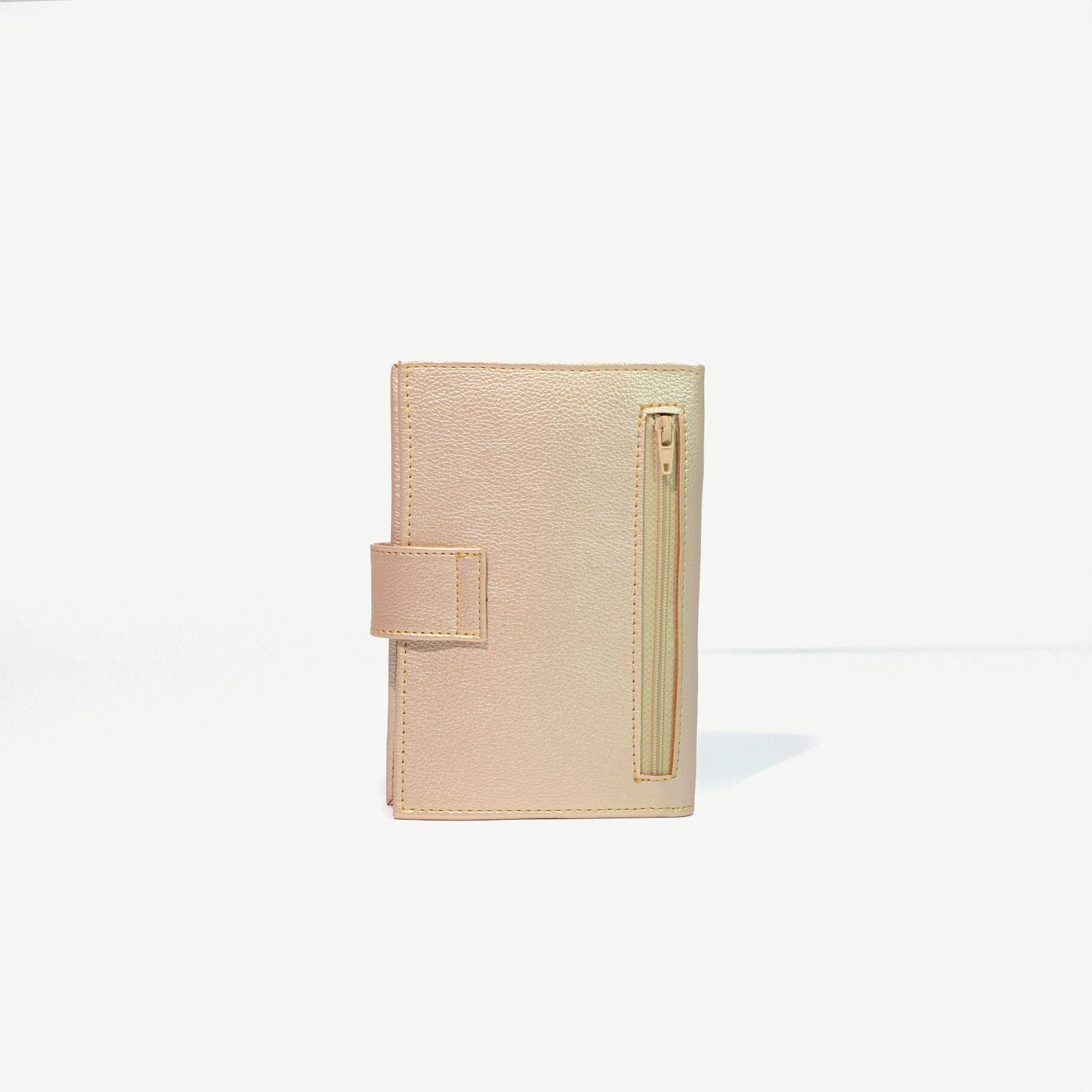 Elaborada en cuero vegano con 5 divisiones para tarjetas, un bolsillo para billetes, un ojal para tu bolígrafo y compartimiento para que lleves hasta 2 pasaportes. En la parte posterior un bolsillo con cierre metálico para llevar las cosas pequeñas.