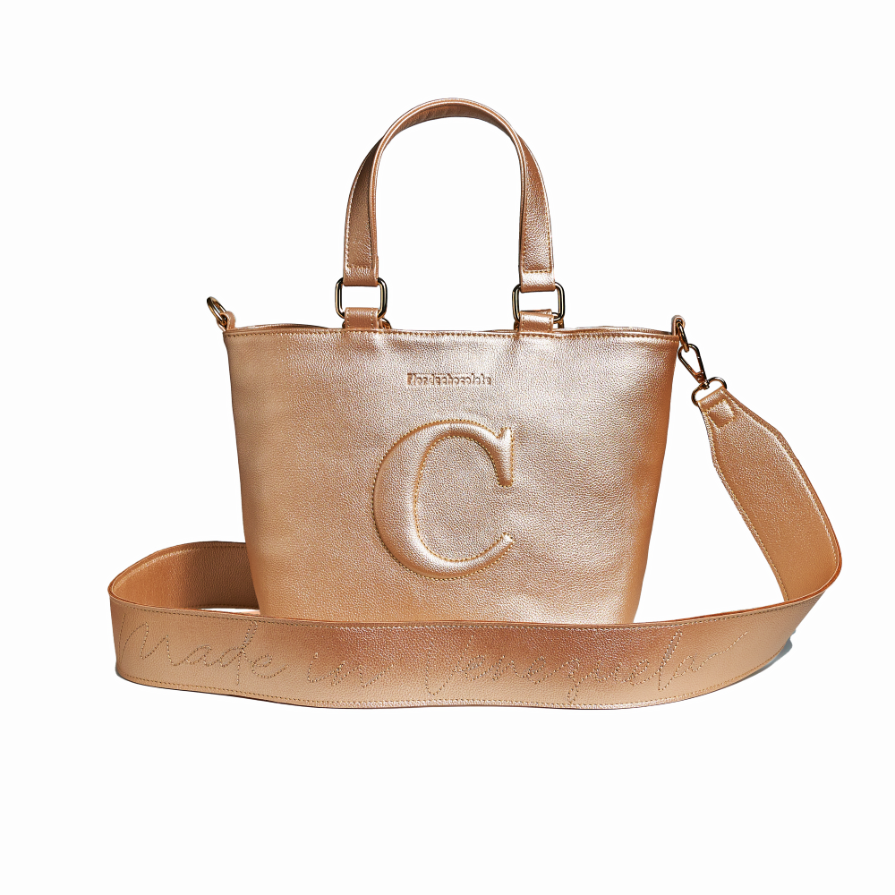 Hecha en cuero vegano, con herrajes dorados, cierre superior, con una hermosa correa removible de 100cm de largo y 4 cm de ancho con nuestro bordado hecho a mano «Made in Venezuela», asas cortas de 14 cm de altura para que la lleves en la mano con estilo, fondo plano. En su interior dos bolsillos y su forro es en textil impermeable.
